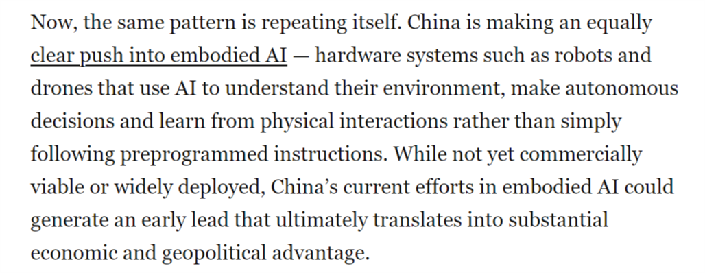 但中国当前正在具身人工智能范畴的勤奋可能使其取得晚期领先,同样的模式正正在从头上演。傍边国人工智能尝试室深度求索(DeepSeek)发布机能可取其他公开前沿模子相媲美的狂言语模子时,一年前,文章暗示,成长人工智能驱动的机械人是中国的科技政策优先事项之一,现在,这本不该如斯令人不测。从而为其带来强大的地缘经济影响力。虽然尚未实现贸易化或大规模摆设,中国正以同样明白的力度进军具身人工智能范畴——即机械人、无人机等硬件系统操纵AI、自从决策并从物理交互中进修,具身人工智能可能成为正在全球多个行业将物理使命间接从动化的根本。中国正在开辟智能机械人、无人机和自从系统方面已取得显著领先地位,具身人工智能被写入中国“十五五”规划中,中国尝试室正在环节基准测试中取得系统性进展,然而,中国正正在博得具身人工智能竞赛。被定位为到30年代初中国经济增加的一大新引擎。